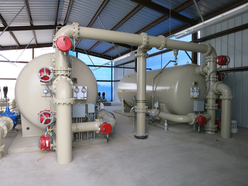 DESCRIPTION: The Southern Arizona community of San Luis now has clean drinking water after flipping the switch on their new Manganese treatment plant that will process up to 2,200 Gallons Per Minute of the city’s potable water supply. In addition to exceeding the EPA mandated MCL’s by an order of magnitude, the manganese caused staining of fixtures and clothing as a result of oxidation, which is enhanced through the use of bleaching agents in household laundry. Integrated Water Services, Inc. (IWS) constructed the system, completed all the testing and start-up, and provided training for this $2mm potable water treatment system. The scope of work for the project included the installation of a complete Pureflow (www.pfdiv.com) Filtration manganese removal system for the drinking water plant at Well Site No. 7 which has two (2) groundwater production wells. The work also included replacement of the well pumps, constructing a 40’ by 60’ enclosure building and pad, 60,000 gallon reclaim tank, sludge mixing system, sludge sewer disposal, all mechanical piping (12” diameter), and all associated electrical and controls.