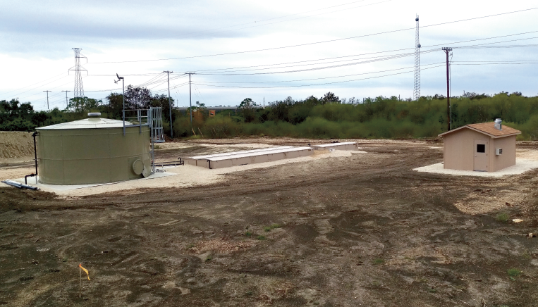 Phase I of the treatment system is composed of two AX-Max textile filter units (www.orenco.com) followed by a liquid chlorine injection system, chlorine contact chamber, and effluent pump system. The system includes a 24’ diameter by 12’ high (40,000 gallon) storage tank to provide surge capacity and equalize peak flows. A level sensor and actuator valve controls the flow into the AX-Max system. A telemetry based control system was provided and installed to allow remote access and monitoring of the treatment system. Following treatment, the effluent is discharged to a creek under a TCEQ surface water discharge permit obtained by M&S. A control building, designed by M&S, is also a part of the overall treatment plant.